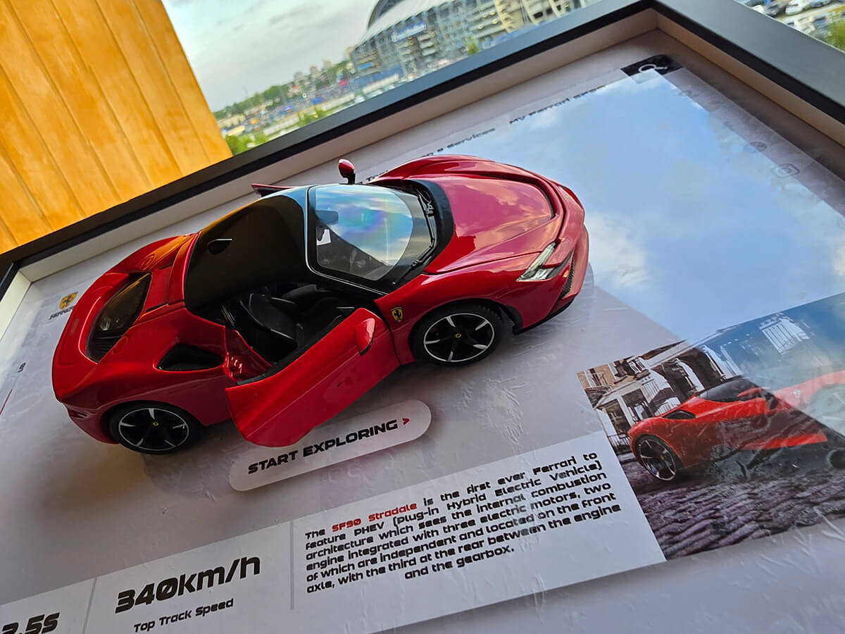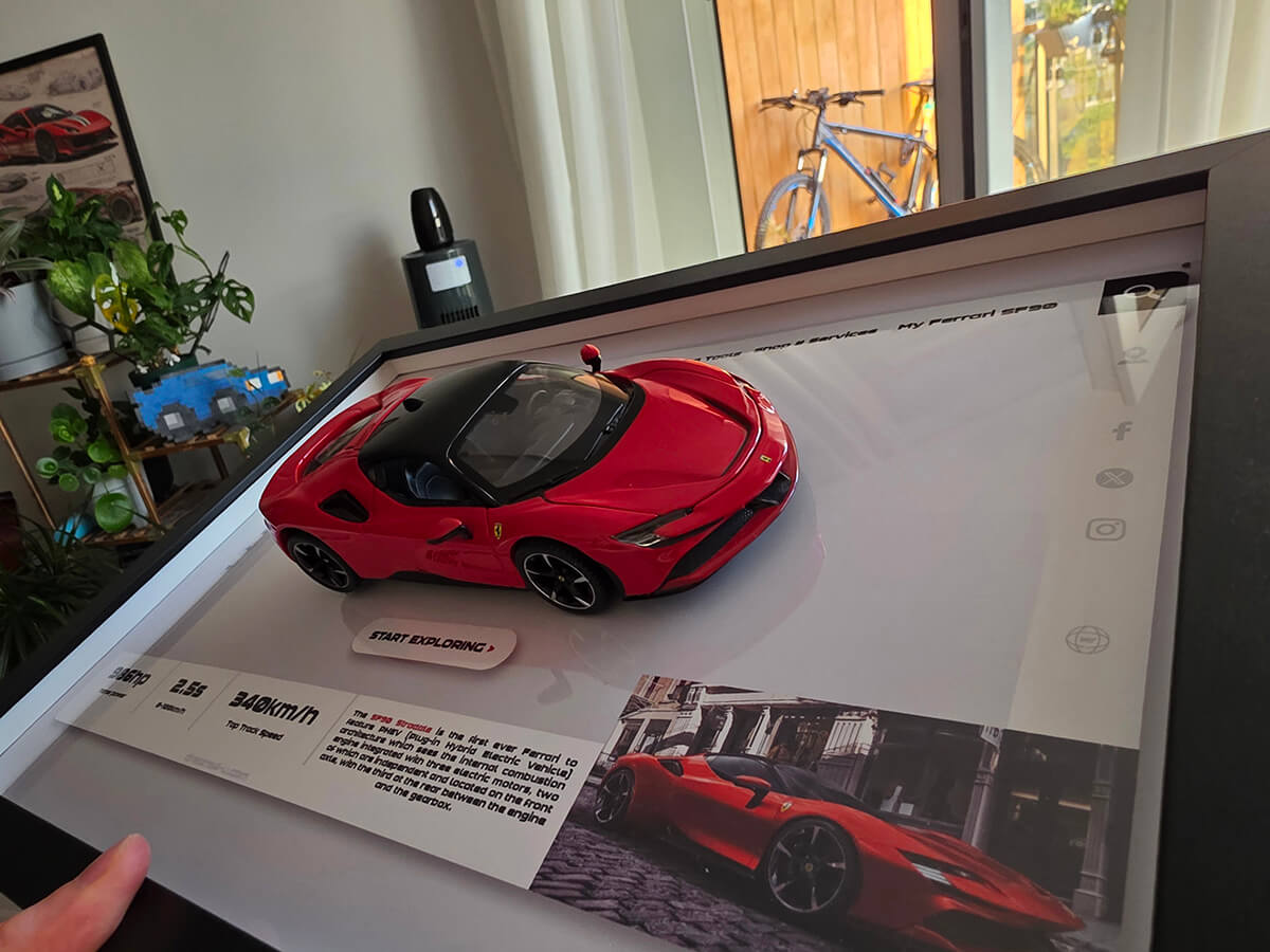 W DREAMS4U otrzymujesz obiekt kolekcjonerski, który łączy formę i funkcję. Model Ferrari SF90 w skali 1:24 mocuję magnetycznie, więc nie jest przyklejony na stałe – jednym ruchem zdejmiesz go do wyczyszczenia lub po prostu, by nacieszyć się detalami lub zabawy; potem “klik” i wraca na miejsce bez śladów kleju. Wariant z opcjonalnym podświetleniem LED dodaje scenie głębi po zmroku, a czerwień nabiera szklistego blasku jak w showroomie.