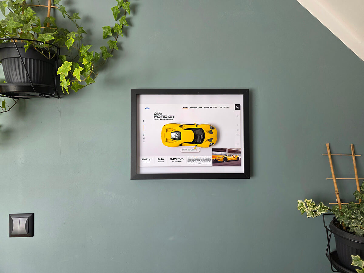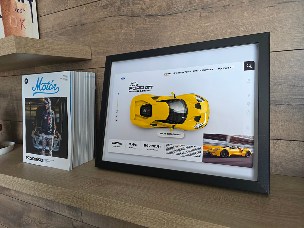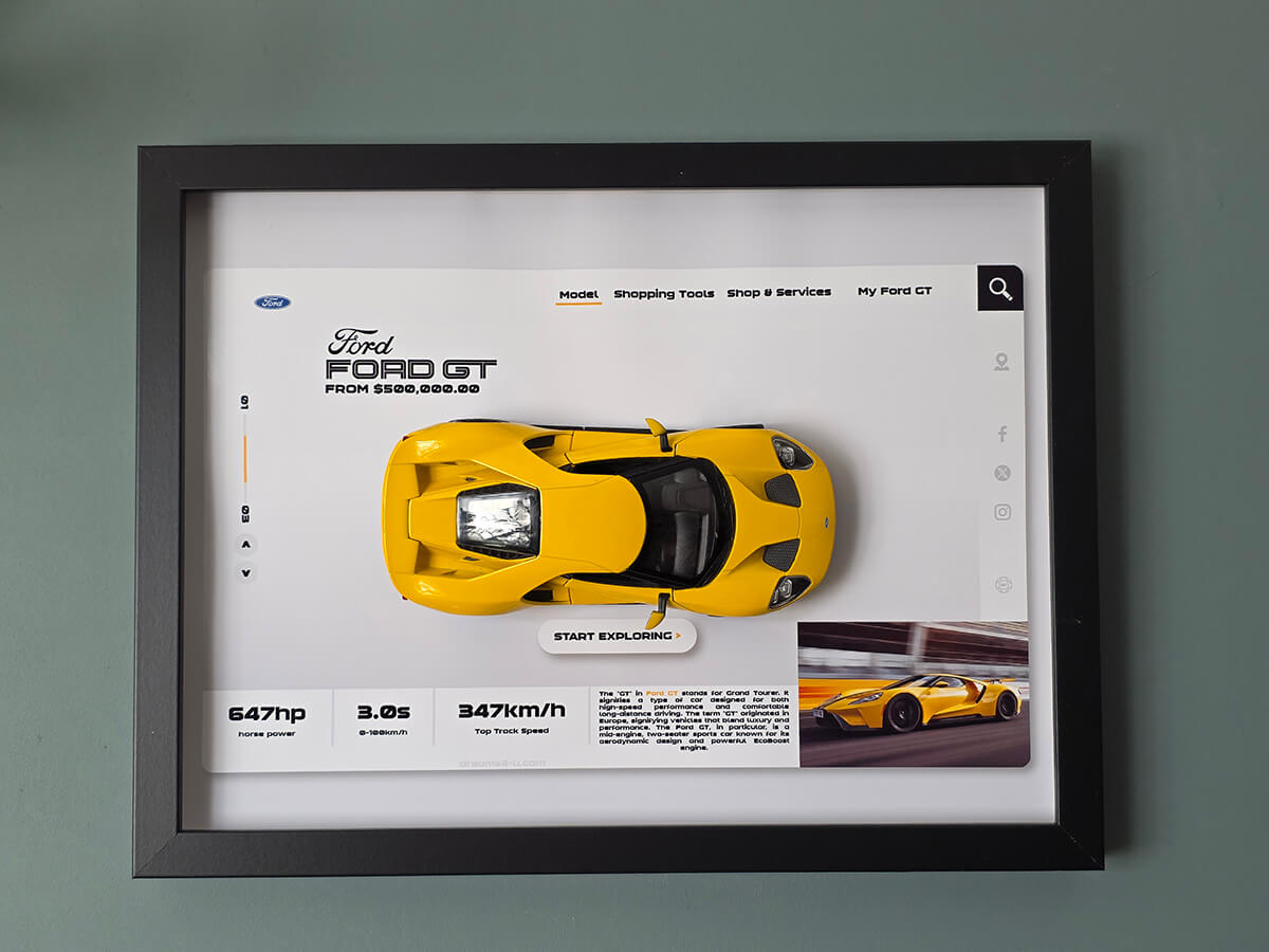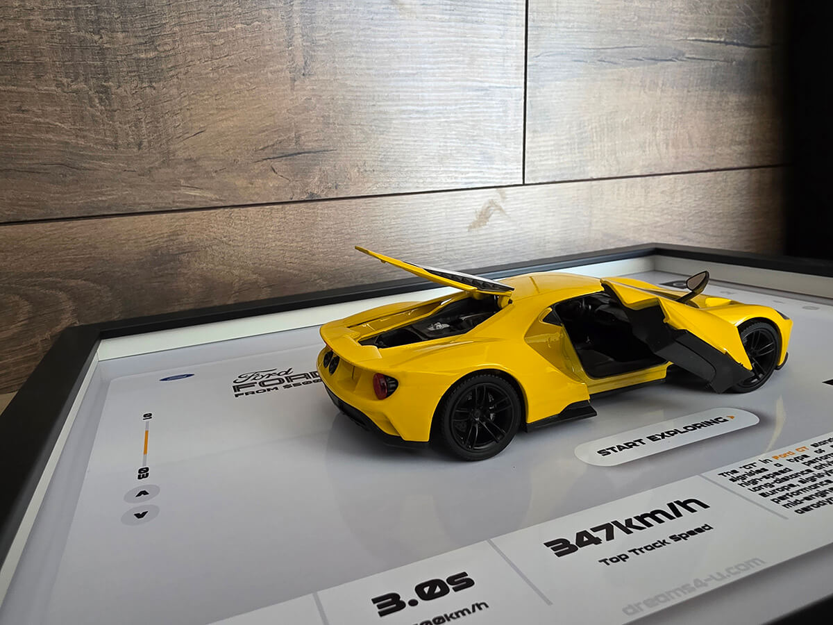 W DREAMS4U otrzymujesz obraz kolekcjonerski, który łączy formę i funkcjonalność! Model Forda GT w skali 1:24 mocuję na magnesie, dlatego nie jest przyklejony na stałe – możesz go bezpiecznie zdjąć do czyszczenia lub po prostu by obejrzeć detale z bliska albo pobawić się z dziećmi, a potem “klik” i wraca na miejsce bez śladu kleju! Smukła głębokość 3 cm sprawia, że format 30×40 cm prezentuje się lekko na ścianie, a jednocześnie zachowuje wyraźny efekt przestrzeni. Ramkę możesz powiesić na ścianie albo postawić na biurku – tam, gdzie najlepiej wybrzmi Twój styl.