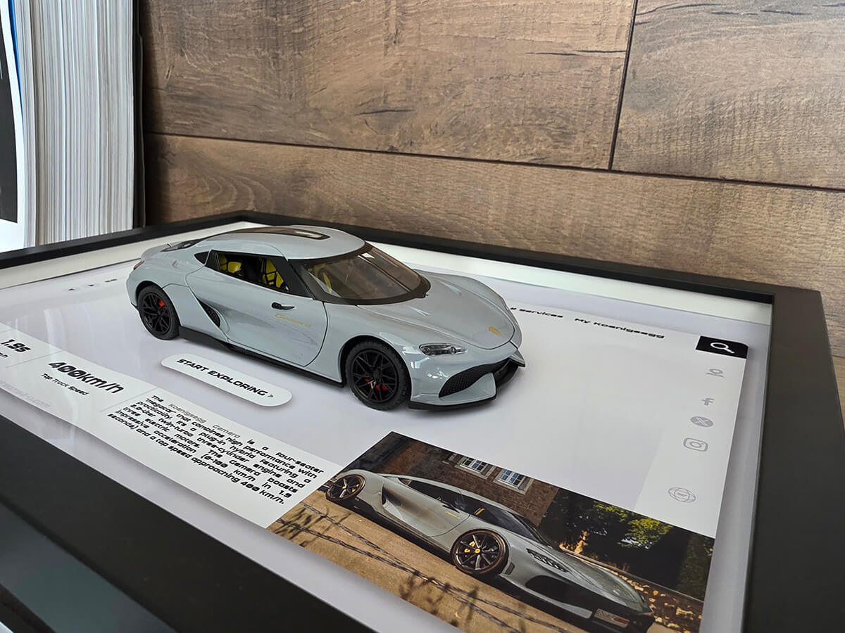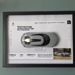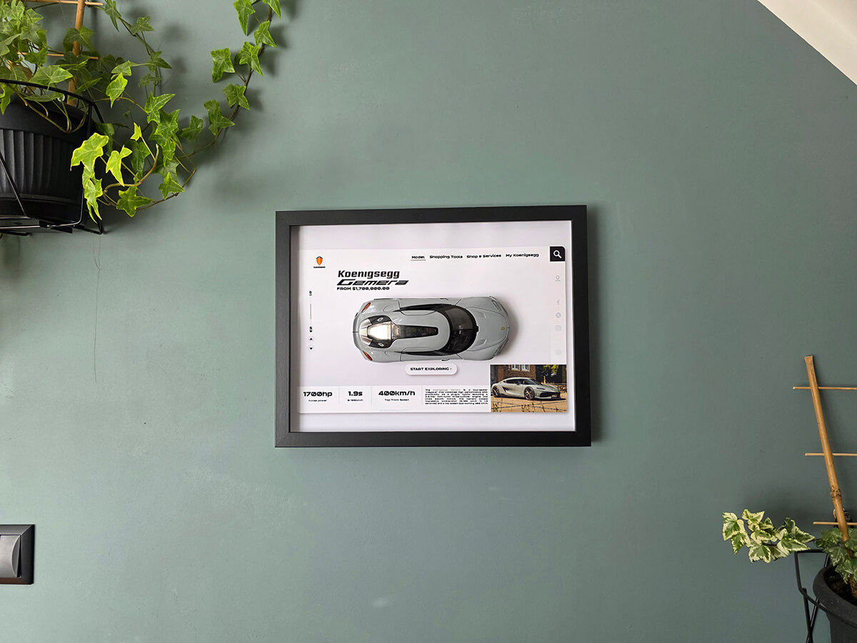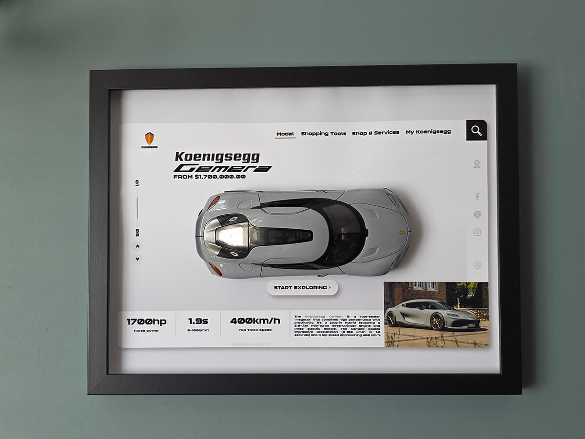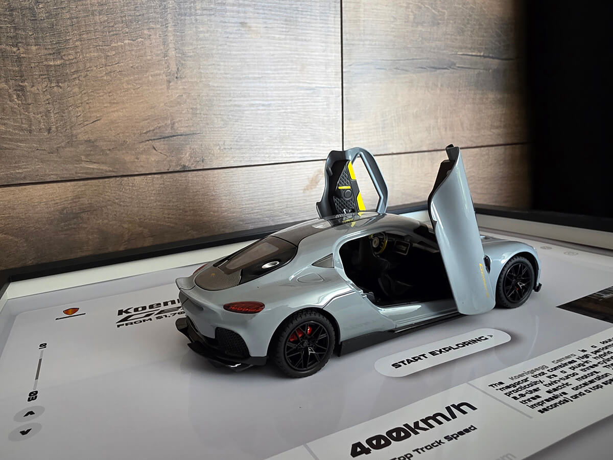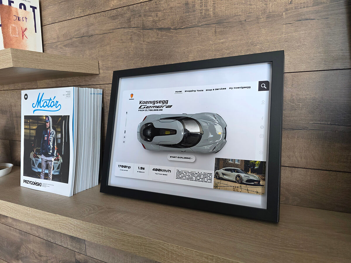 Kupując w DREAMS4U otrzymujesz obiekt kolekcjonerski łączący formę i funkcję. Model Koenigsegga Gemery w skali 1:24 mocuję magnetycznie, więc nie jest przyklejony na stałe: jednym ruchem zdejmiesz go do czyszczenia albo po prostu, by nacieszyć się detalami, a potem “klik” – wraca na miejsce bez śladu kleju. Na życzenie montuję również subtelne podświetlenie LED, które po zmroku wydobędzie bryłę i nada scenie efektu showroomu. Smukła głębokość 3 cm sprawia, że format 30×40 cm prezentuje się lekko, zachowując wyraźny efekt 3D.