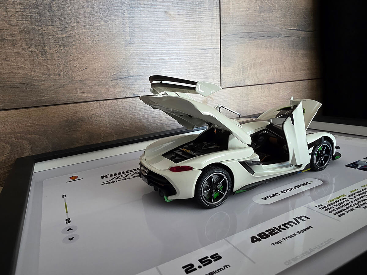 Marzysz o tym, aby choć na chwilę poczuć się jak właściciel legendarnego hiperauta? Z DREAMS4U te motoryzacyjne fantazje stają się rzeczywistością! Przedstawiam Tobie unikalny obraz 3D z modelem Koenigsegg Jesko Attack w skali 1:24, osadzonym w eleganckiej czarnej ramie (30x40x3cm). Kontrastująca biel auta i dynamiczne tło inspirowane oficjalnym konfiguratorem pojazdu tworzą niezwykły efekt – to tak, jakbyś przeniósł wnętrze showroomu do swojego salonu! Każdy detal został dopracowany z pasją, byś poczuł moc drzemiącą w tym potężnym aucie!