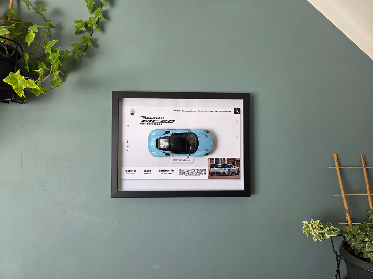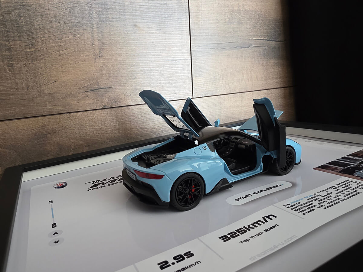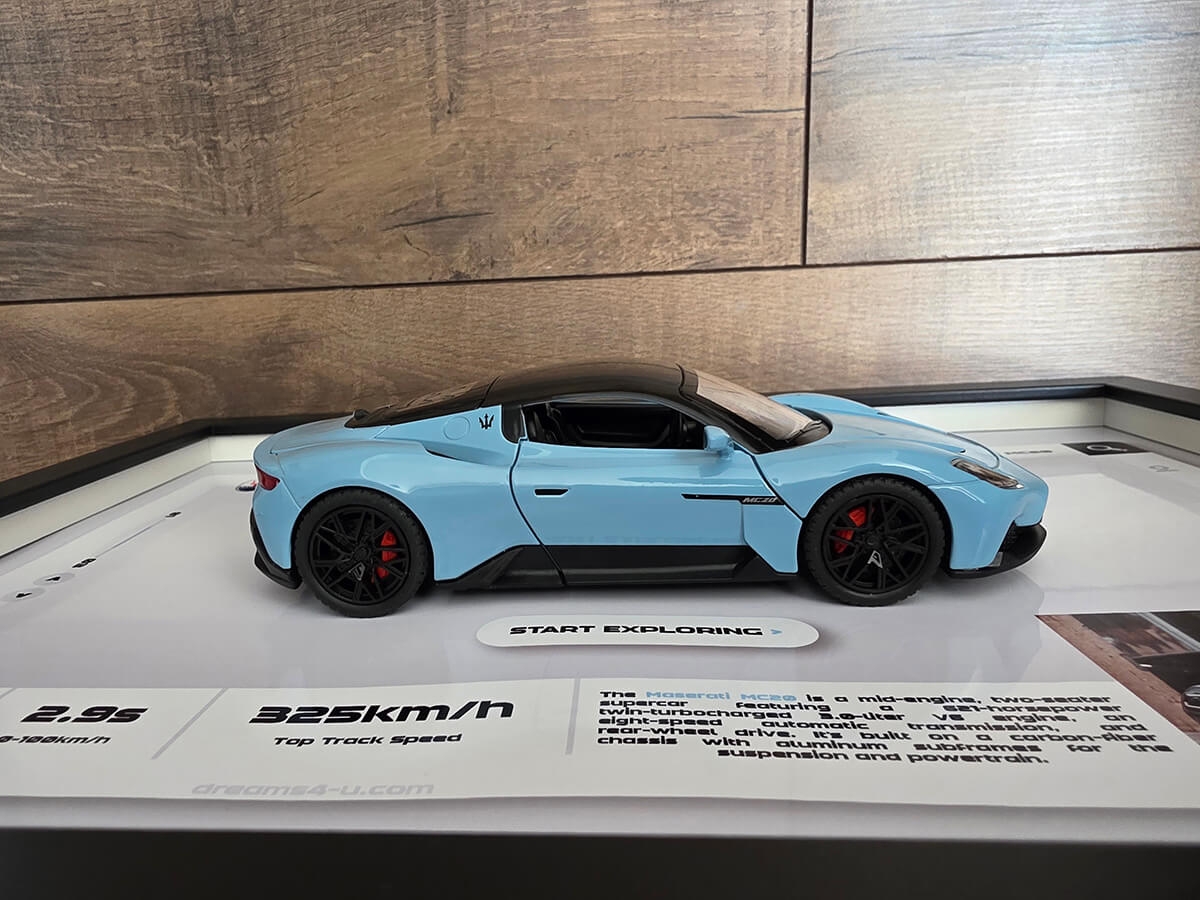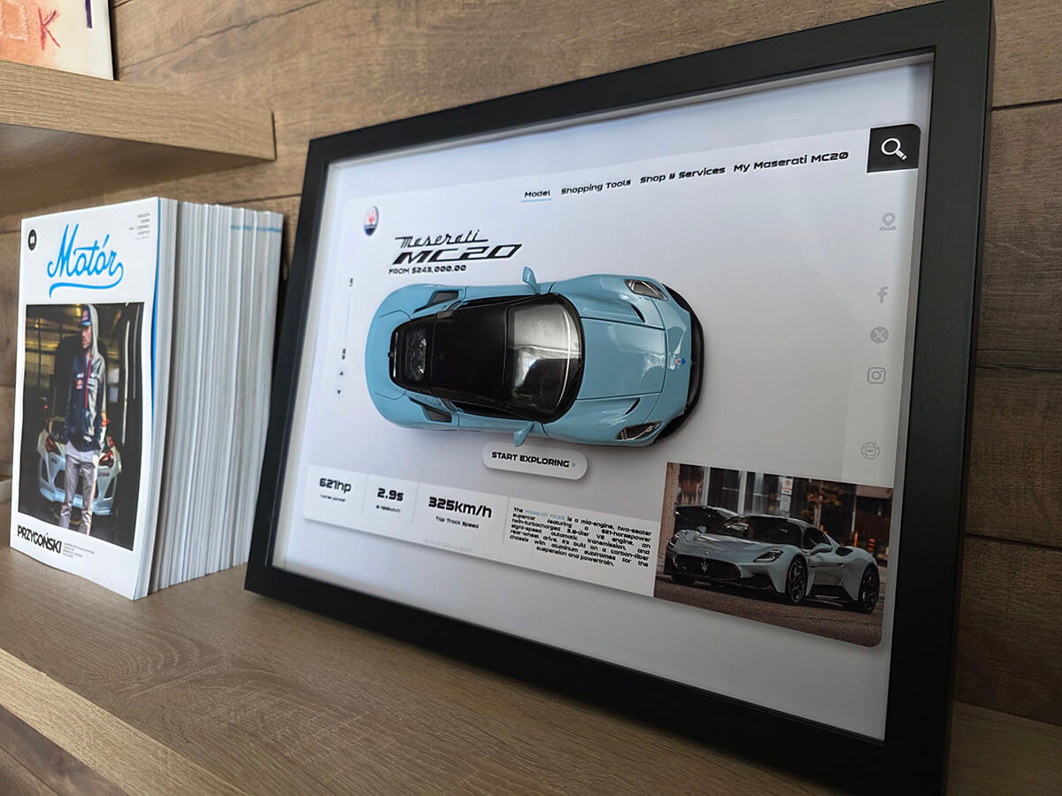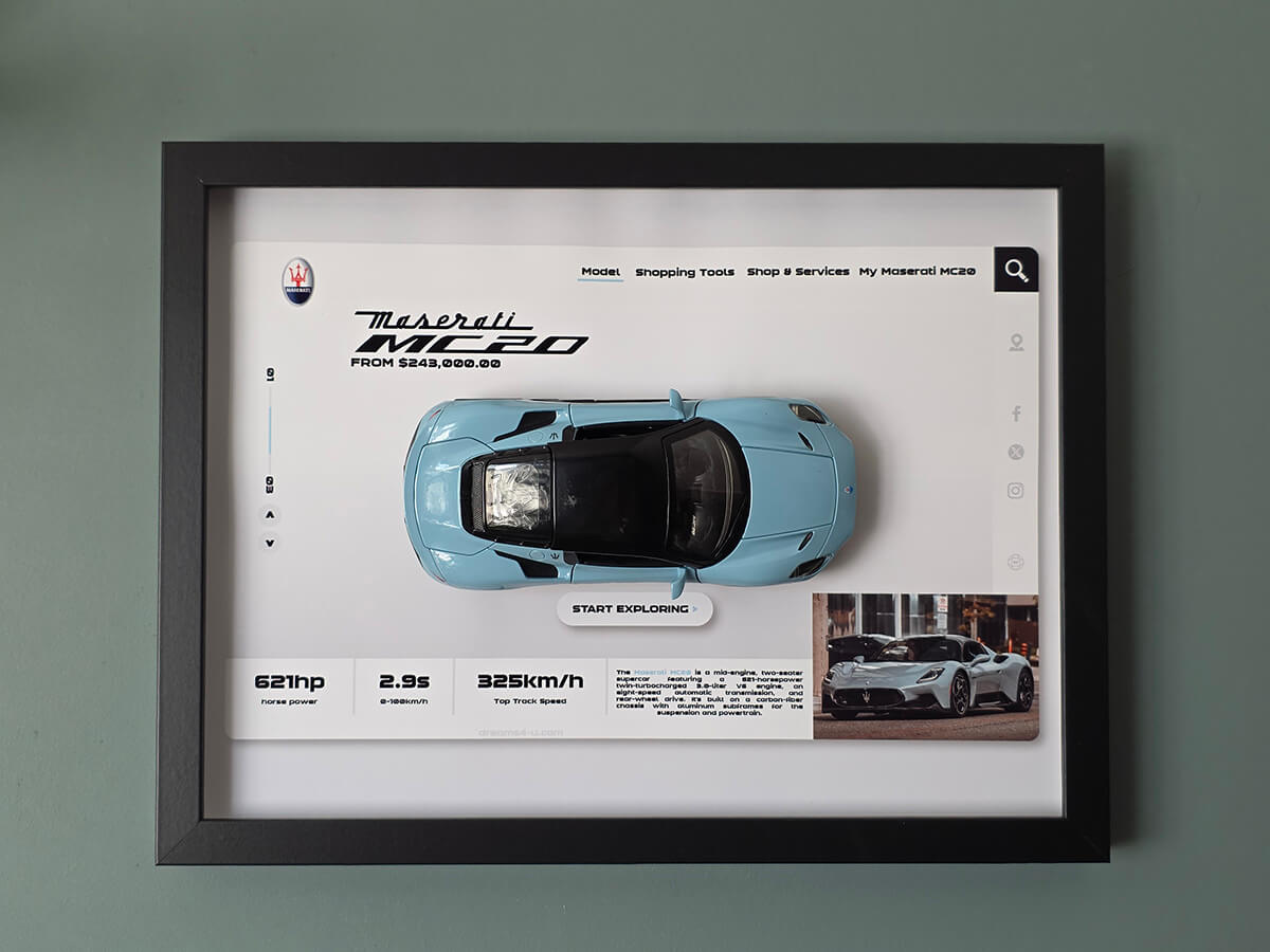 Otrzymujesz więc kompletne dzieło gotowe do ekspozycji – postaw je na biurku lub zawieś na ścianie. Każdy szczegół Twojego nowego obrazu 3D z Maserati MC20 przypomina o pasji do motoryzacji i prędkości. Masz w garażu własne Maserati? Teraz powieś je także na ścianie! Jeśli jeszcze go nie masz, z DREAMS4U możesz je zwizualizować w swoim wnętrzu. Spełniam Twoje marzenia motoryzacyjne, przenosząc je do codzienności. Wystarczy jedno spojrzenie na błękitne Maserati MC20, by poczuć dreszcz emocji wyścigowego ducha. Wybierz ekskluzywną dekorację, która uzupełni wystrój i podkreśli Twój styl – każdy dzień z nią krok bliżej do realizacji Twoich najodważniejszych marzeń o Maserati MC20!