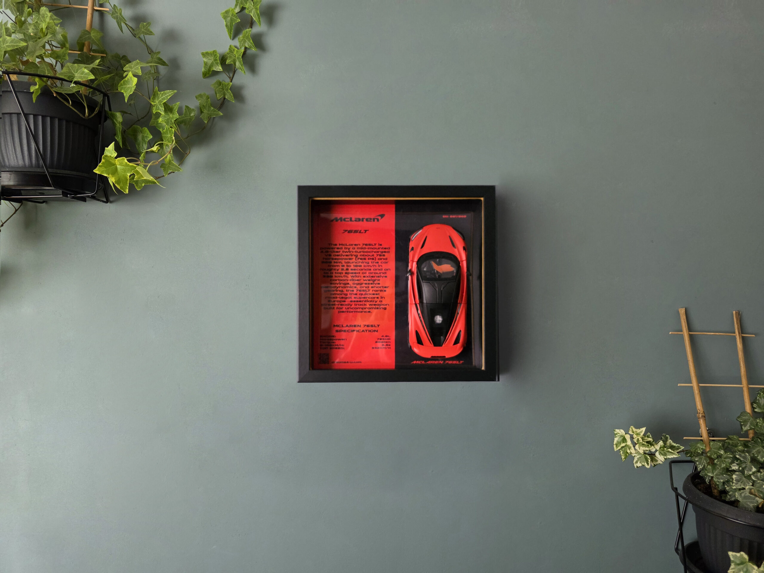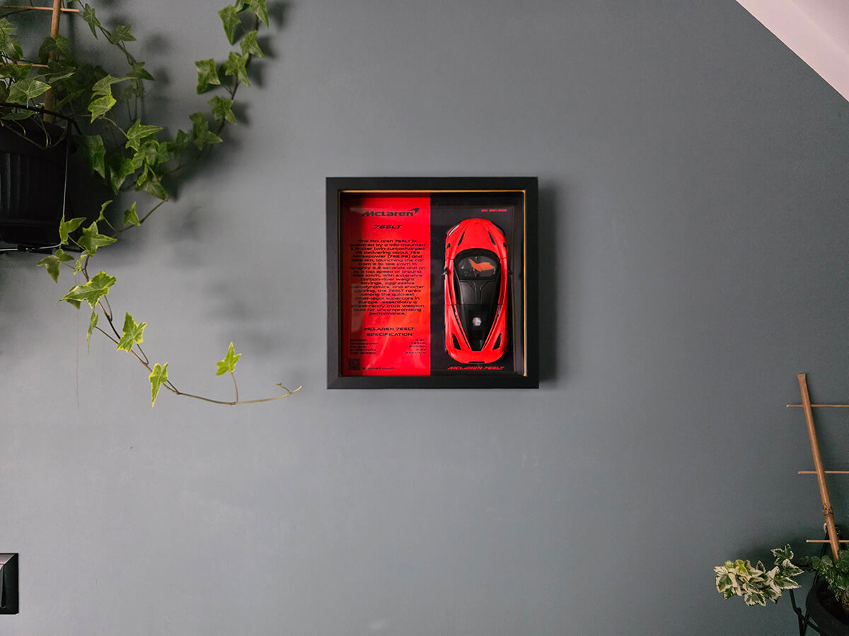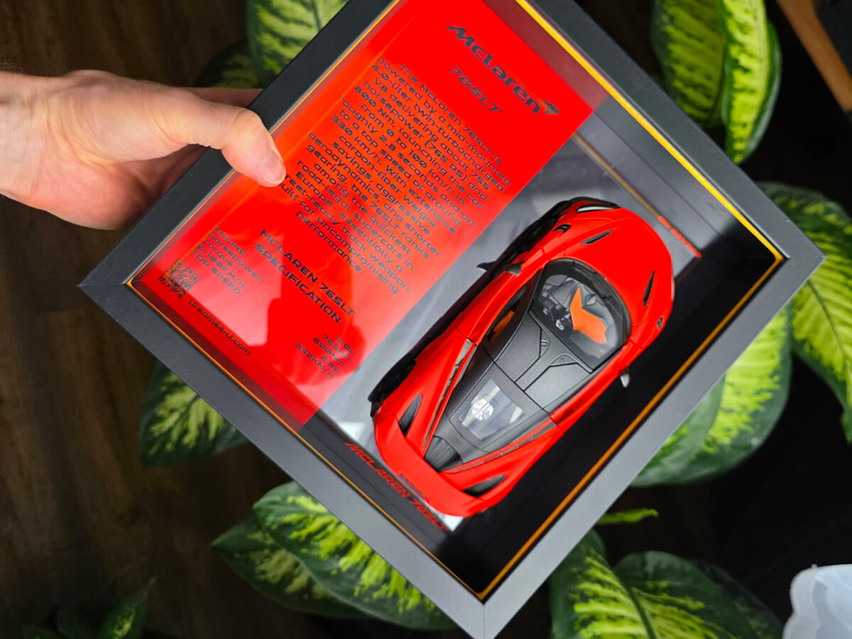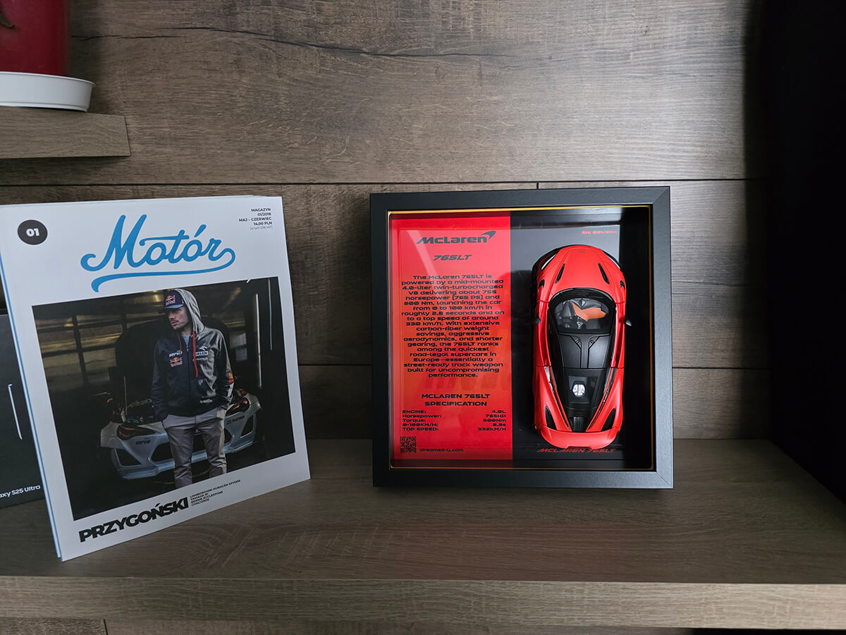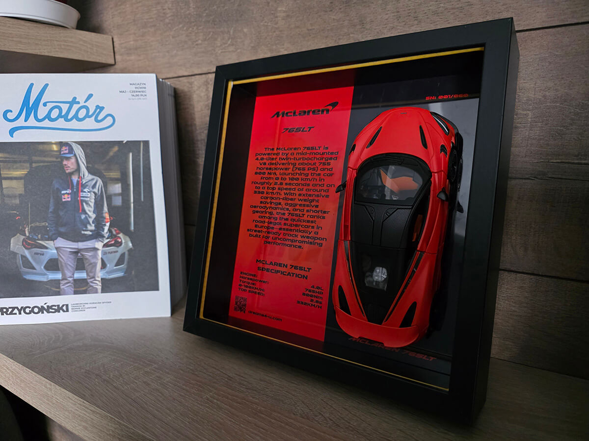 Dzięki magnetycznemu mocowaniu model możesz z łatwością zdjąć z obrazu – dla czyszczenia lub odrobiny zabawy – po czym ponownie umocować go bez utraty stabilności. Ramka o wymiarach 25×25×6 cm sprawdzi się zarówno jako dekoracja na biurku, jak i zawieszona na ścianie Twojego garażu lub pokoju. Opcjonalne podświetlenie LED (dostępne na zamówienie) wydobywa detale modelu i nadaje mu futurystycznego blasku po zmroku. W DREAMS4U spełniam marzenia – czy masz już 765LT w garażu, czy dopiero o nim marzysz, teraz możesz go mieć na wyciągnięcie wzroku w swoim domu.