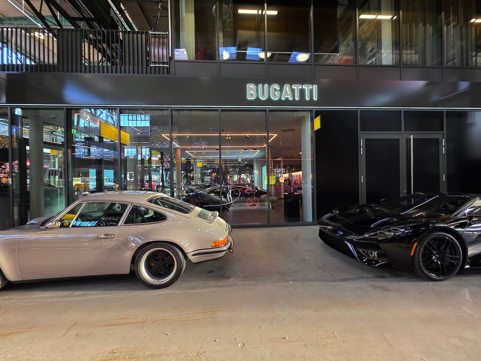 Wjeżdżając na teren Motorworld, od razu poczuliśmy zapach benzyny i adrenalinę. Pierwszym witającym nas autem było różowe Porsche 911 GT3 „Pink Pig”, wersja legendarnego malowania ze startów Porsche 917/20. Ta kultowa “różowa świnka” wyścigowa zwie się dokładnie Sau i naprawdę robi wrażenie! Od razu wiedzieliśmy, że jesteśmy we właściwym miejscu. Dalej były już tylko cuda: pod jednym dachem zobaczyliśmy kilka wersji Chiron’a i Veyrona od Bugatti, Ferrari Enzo i LaFerrari, amerykańskie klasyki i motocykle BMW, a także salon 7PL – który również chciałem zobaczyć! W salonie 7PL stoją zazwyczaj prawdziwe cudeńka (można tam spotkać nawet Pagani Huayra i Zondę przy odrobinie szczęścia – nam niestety go zabrakło), więc serce mi biło szybciej na myśl, że krajowi dealerzy mają tu swoje ekspozycje.
