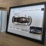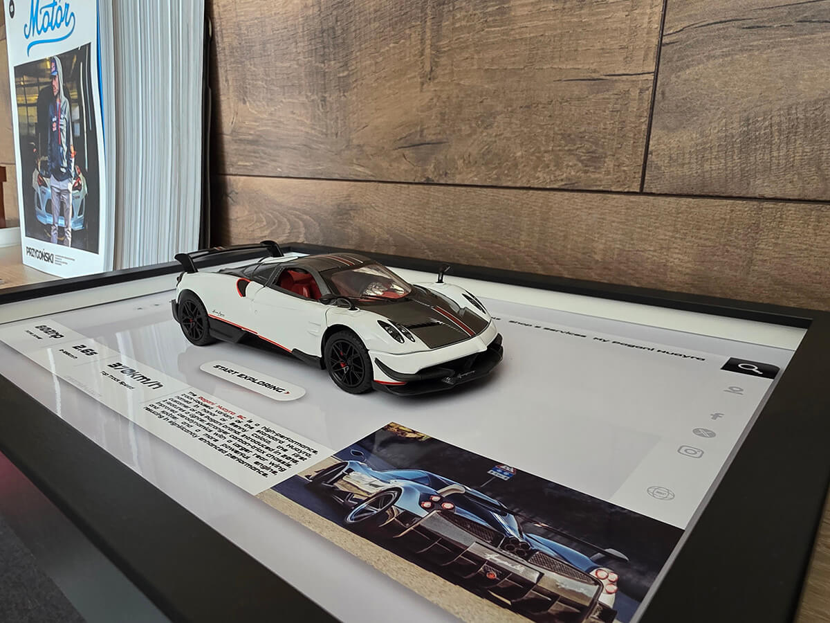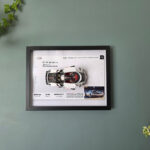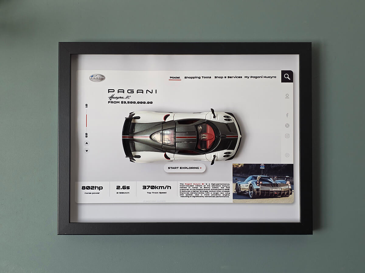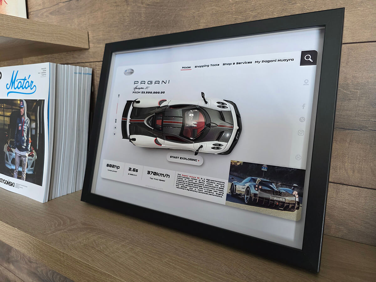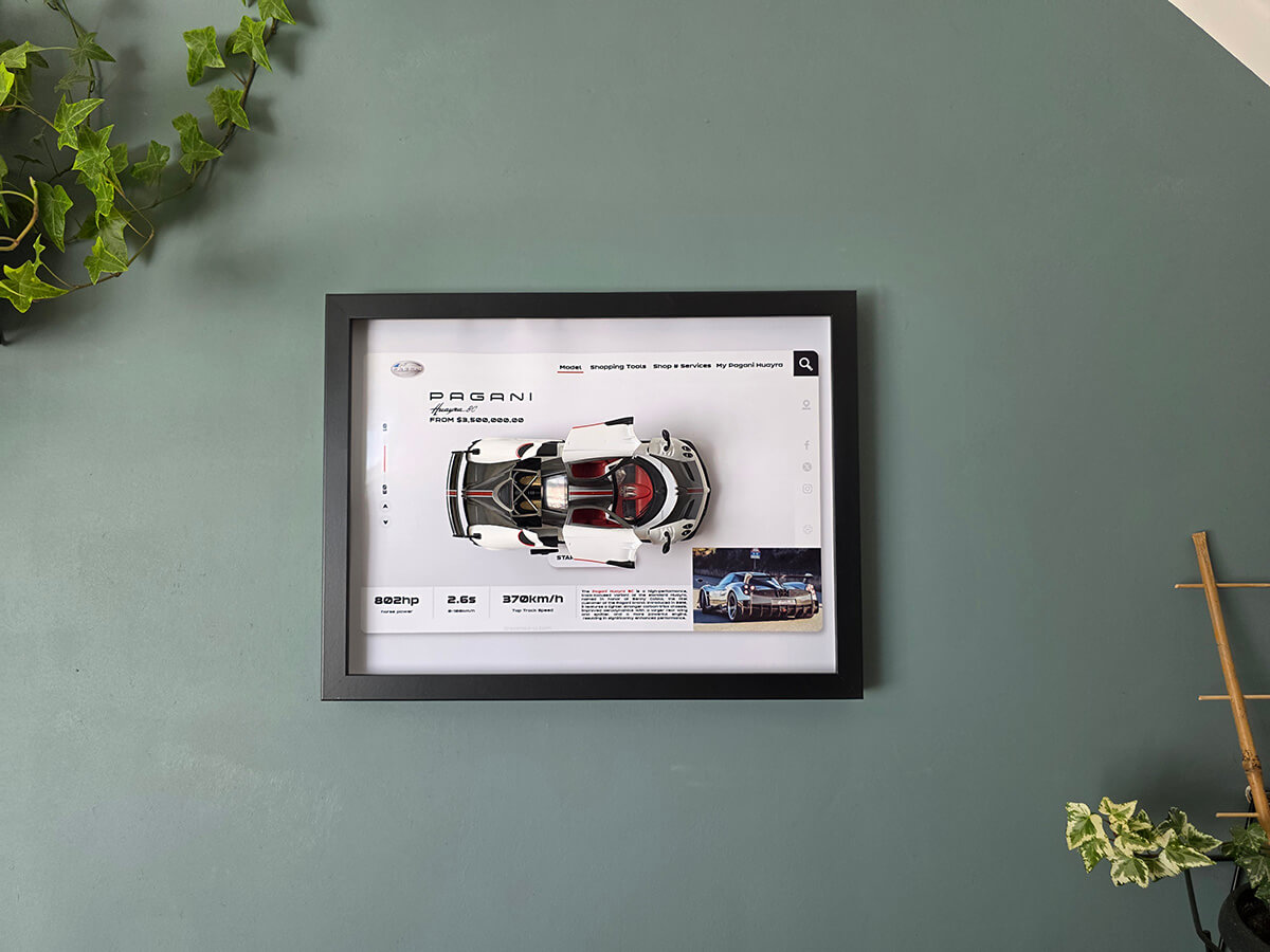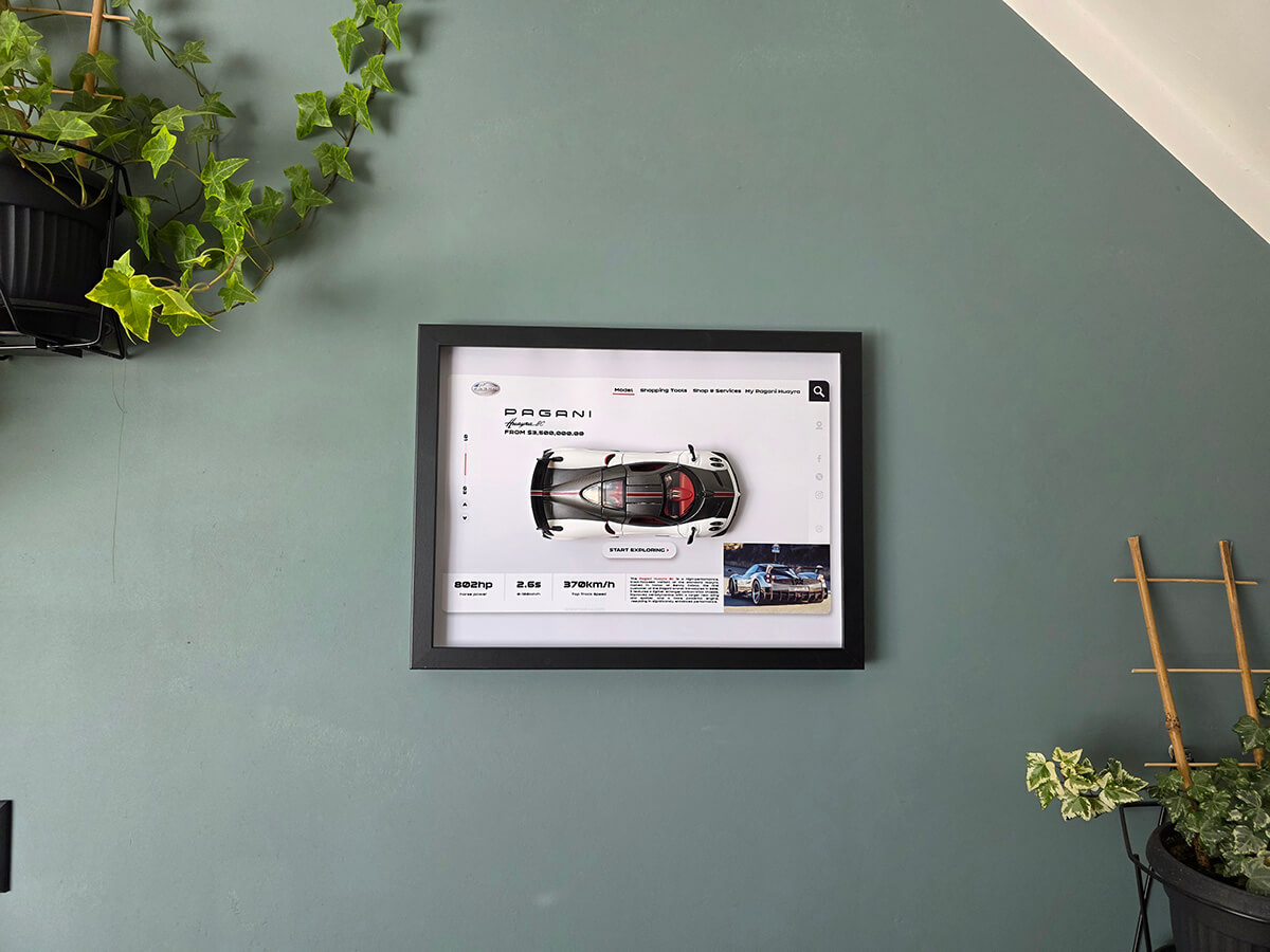 W DREAMS4U otrzymujesz obiekt kolekcjonerski, który łączy formę i funkcje. Model Pagani Huayra BC w skali 1:24 mocuję magnetycznie, więc nie jest przyklejony na stałe – zdejmiesz go jednym ruchem, wyczyścisz, obejrzysz z bliska i bezpiecznie umieścisz z powrotem, bez śladów kleju. Na życzenie dodam subtelne podświetlenie LED, które po zmroku podkreśla przetłoczenia i tworzy klimat prawdziwego showroomu. Smukła głębokość ramki 3 cm sprawia, że format 30×40 cm wygląda lekko na ścianie, a jednocześnie daje wyraźny efekt 3D.