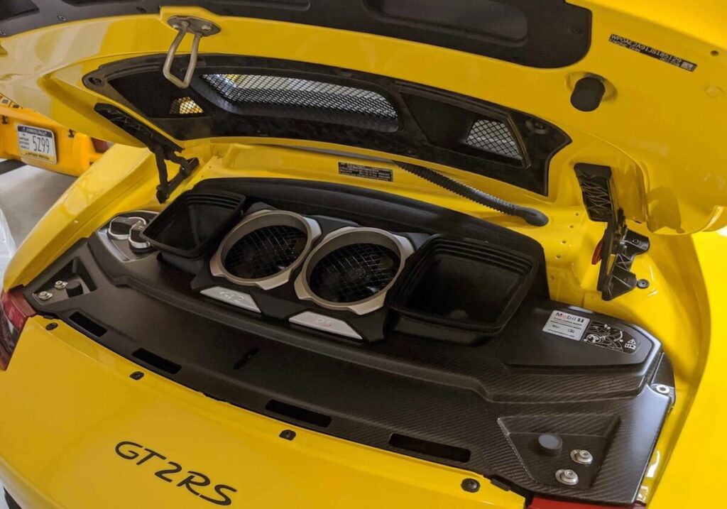 Sercem Porsche 911 GT2 RS jest 3.8-litrowy silnik typu bokser (w układzie sześciocylindrowym przeciwsobnym) wspomagany dwiema turbosprężarkami. Jednostka bazuje na sprawdzonym silniku modelu 911 Turbo S, ale została gruntownie wzmocniona i zmodyfikowana. Inżynierowie Porsche zastosowali większe turbosprężarki o zmiennej geometrii, powiększone intercoolery z dodatkowym natryskiem wodnym (dla skuteczniejszego chłodzenia powietrza doładowującego) oraz przeprojektowali układ dolotowy i tłoki – wszystko po to, by bezpiecznie uzyskać imponujące 700 KM mocy i 750 Nm momentu obrotowego. Dla porównania, to o 80 KM więcej niż oferowała poprzednia generacja GT2 RS z 2010 roku. Maksymalną moc osiąga przy 7000 obr/min, a pełny moment dostępny jest w szerokim zakresie ok. 2500–4500 obr/min, co oznacza, że potężne przyspieszenie jest dostępne niemal na zawołanie.
