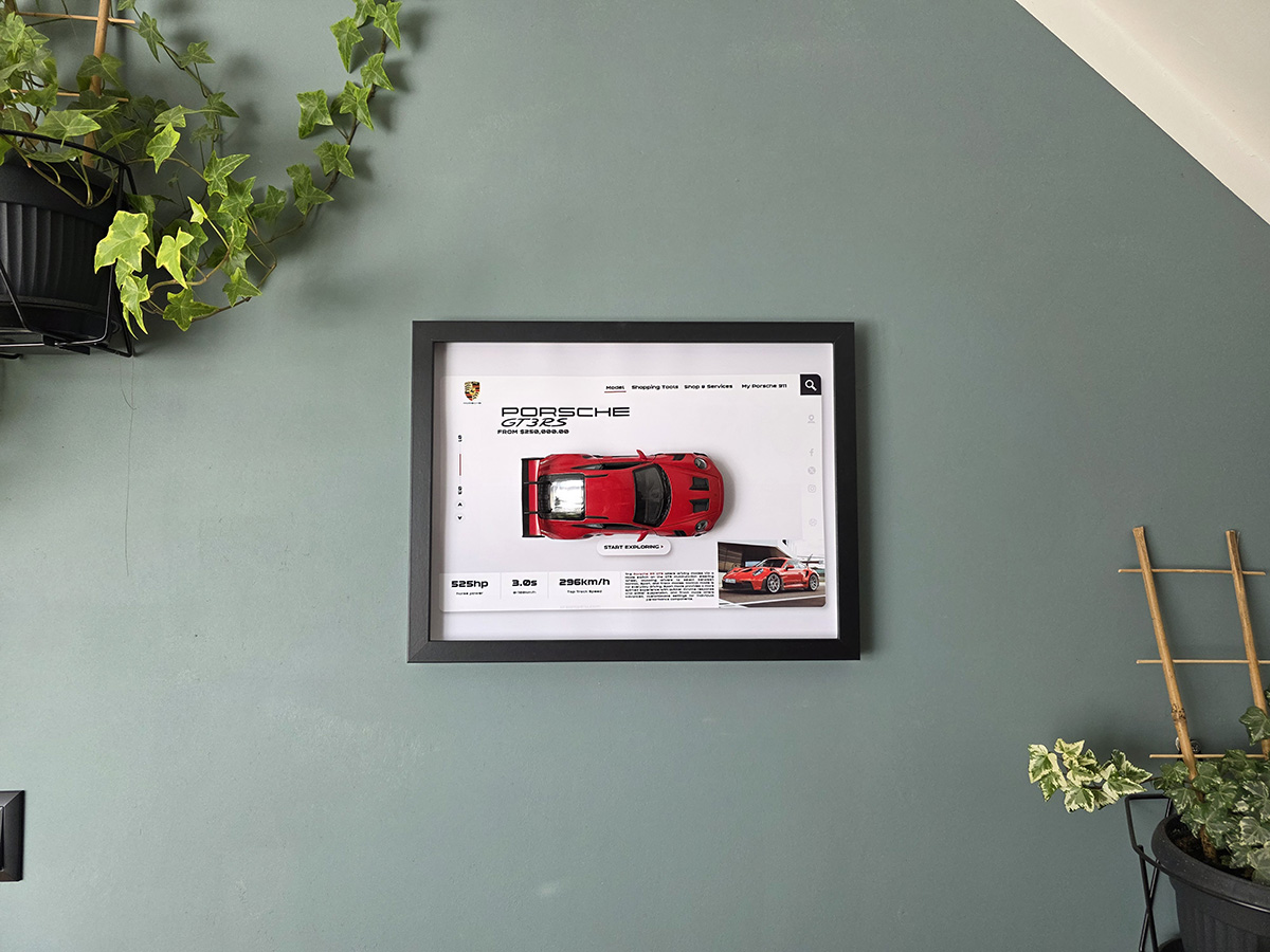 To tutaj praktyczność spotyka się z pasją: model Porsche 911 GT3 RS w skali 1:24 zamocowany jest na magnes, więc nie jest przyklejony na stałe. Bez trudu zdejmiesz go do czyszczenia lub chwili zabawy z dziećmi, a potem pewnie umocujesz z powrotem – bez śladów i bez ryzyka. Smukła grubość ramki (3 cm) sprawia, że format 30×40 cm wygląda lekko na ścianie, a jednocześnie oferuje wyraźny efekt 3D. Masz Porsche 911 GT3 RS w garażu? Powieś go również na ścianie by dopełnić charakteru wnętrza! Jeszcze o nim marzysz? Zwizualizuj – i miej je zawsze w polu widzenia.