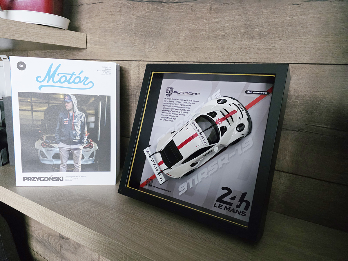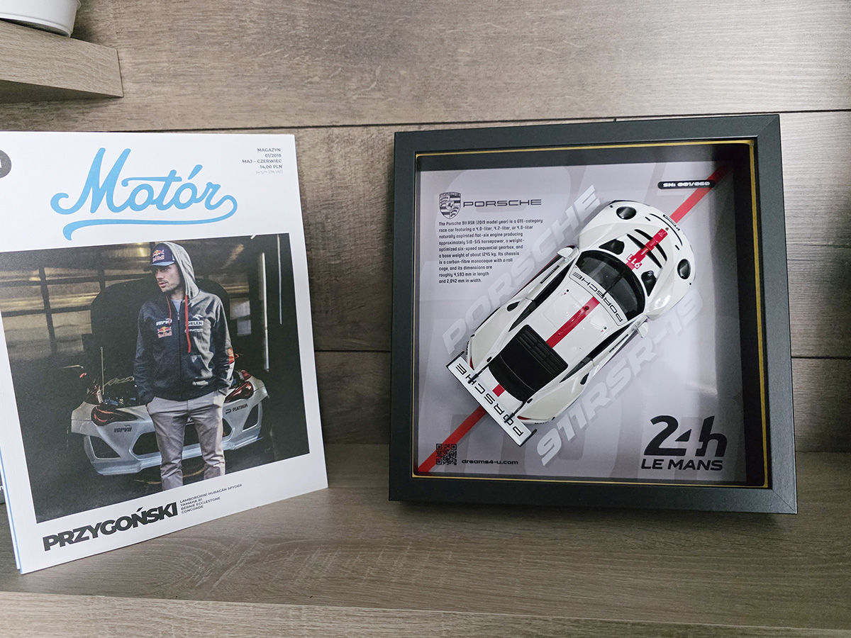 Porsche 911 RSR to esencja wyścigowej 911-tki – lekkość, aerodynamika i bezkompromisowa precyzja. Otrzymujesz model w skali 1:24, w którym detale sylwetki i przetłoczeń grają pierwsze skrzypce na tle zaprojektowanym przeze mnie od podstaw. Każdą grafikę tworzę ręcznie: od szkicu, przez kolor, aż po finalne wykończenie – dlatego każdy egzemplarz różni się subtelnymi akcentami i pozostaje naprawdę unikalny.