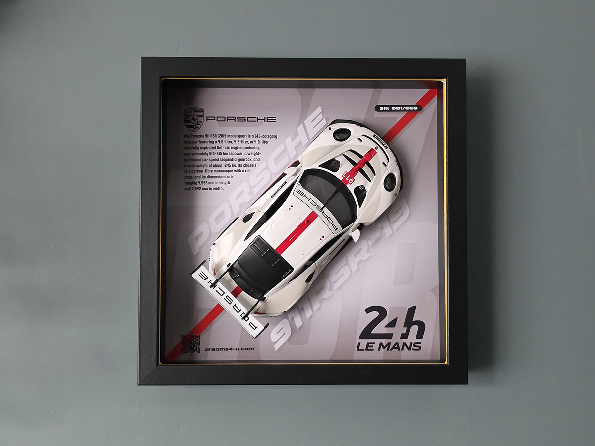 Praktyczność spotyka pasję: model mocuję na magnes, więc nie jest przyklejony na stałe. Bez trudu zdejmiesz go do czyszczenia lub krótkiej zabawy, a potem pewnie umieścisz z powrotem – bez śladu i bez ryzyka. Na życzenie dodam subtelne podświetlenie LED, które po zmroku wydobędzie linie nadwozia i nada kompozycji klimatu toru nocą. Masz w padoku Porsche 911 RSR? Powieś ją na ścianie. Jeszcze o niej marzysz? Zwizualizuj – i miej zawsze w zasięgu wzroku.